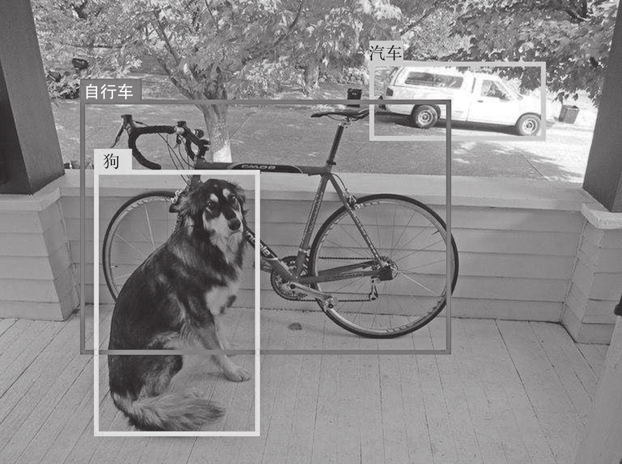 (1)目标检测 这里的目标是定位或检测给定图像中是否存在感兴趣的目标。例如图3.4中通过机器视觉很好地检测出狗、自行车和汽车。视觉系统仅通过预先训练的“黄金图像”或“模式”进行识别,并将其与来自相机的实时图像进行比较。
