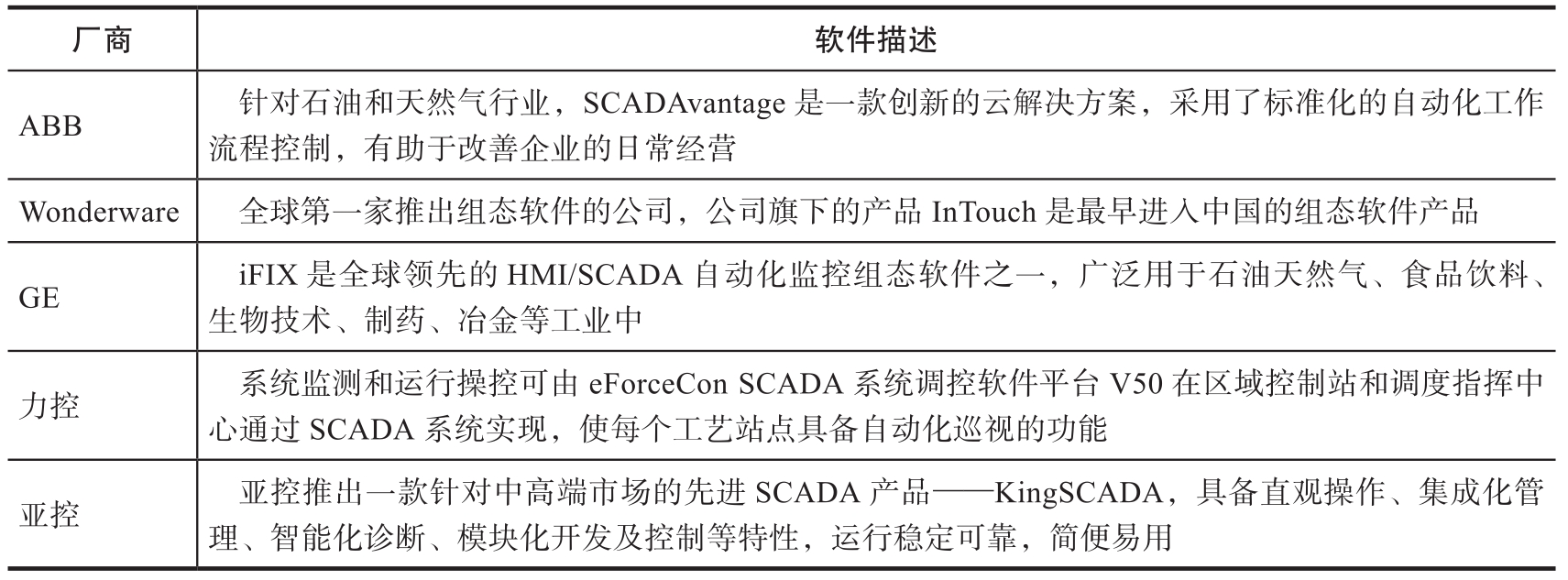 近几年,国内外知名的硬件和系统厂商发布了一系列成熟的组态软件产品,例如美国AB公司(现隶属于罗克韦尔自动化)的RSView以及GE公司的Cimplicity和iFIX。同时,国内自主开发的组态软件产品也崭露头角,其中一些产品(如ControlX、虎翼、SYNALL、MCGS、天工、力控、组态王等)逐渐影响着国内组态软件市场的格局。典型的组态软件如表2-2所示。