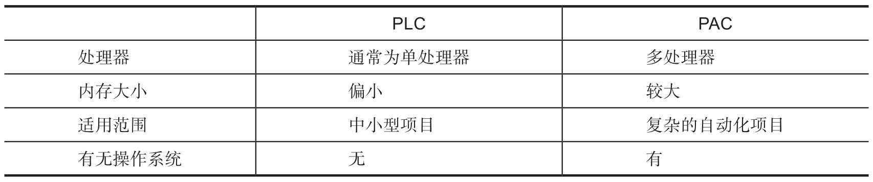 相对于PLC,PAC展现出更为卓越的软件性能。这是因为它的效能建立在嵌入式硬件系统、背板总线、轻巧的控制引擎和通用标准的实时操作系统上,而无须依赖硬件芯片。PLC与PAC的差异如表2-1所示。