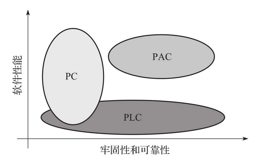 ❑集成控制阶段。从20世纪80年代开始,PLC进入了集成控制阶段。随着电气自动化领域科技的不断发展,PLC开始与其他系统进行整合,如人机界面、数据采集等,还出现了PAC(可编程自动化控制器)。PAC是将PLC和PC的优势融合的设备,充分整合了PC的第三方软件支持、强大的通信处理能力和计算能力,同时保留了PLC的耐用、可靠和方便操作等特点。PLC从单纯的数控装置变成了可编程、可扩充的现代化控制系统。PC、PLC和PAC在软件性能、牢固性和可靠性上的差异如图2-3所示。