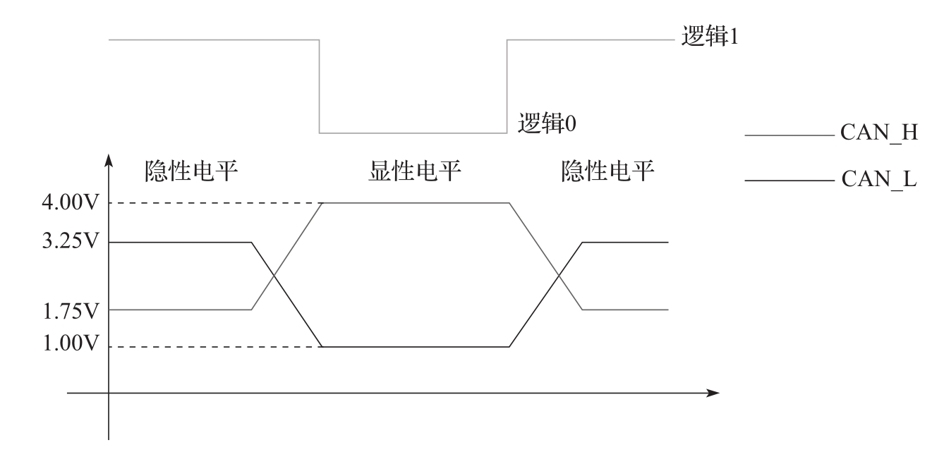CAN(Controller Area Network)由德国BOSCH公司开发,最终演变为国际标准(ISO 11898),并成为全球应用最为广泛的现场总线技术之一。CAN只采用了OSI模型中的两层,即物理层和数据链路层。以低速CAN为例,它也采用差分电压的方式进行信号传输,两条信号线分别被称为CAN_H和CAN_L,隐性位时CAN_H电压高于CAN_L,表示逻辑“1”,显性位表示逻辑“0”,图3-7展示了电压与逻辑位的关系,电压差在1.5V和3V之间时为隐性电平,电压差为3V时为显性电平。