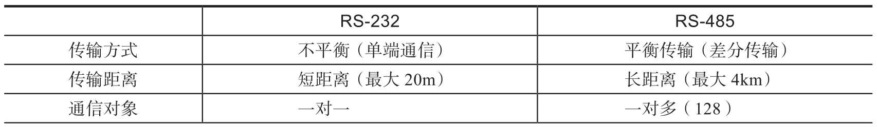 RS-232和RS-485在工业领域已经得到广泛使用,表3-1展示了RS-232和RS-485两种标准在传输方式、传输距离、工作模式等方面的异同。