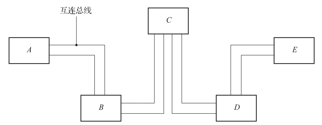 总线协议多采用RS-485标准,因为该标准采用差分电路,支持一主多从的通信方式,且具有较强的抗干扰能力以及较远的传输距离。菊花链拓扑结构是RS-485总线布线的标准及规范,是TIA等组织推荐使用的拓扑结构。在这种拓扑结构中,主控设备与多个从控设备以手拉手的方式相连,形成一条连续的链路。以图3-6为例,假设RS-485总线上有设备 A 、 B 、 C 、 D 、 E ,布线方法是将 A 的485+端口连接至 B 的485+端口,然后从 B 的485+端口引出一条线至 C 的485+端口,以此类推,直至 E 的485+端口。485-端口的接线方式与485+端口相同。这种布线策略减少了信号反射,提高了通信成功率,且不需要额外设备,具有诸多优势。除了菊花链拓扑结构外,还有星形拓扑与总线拓扑。
