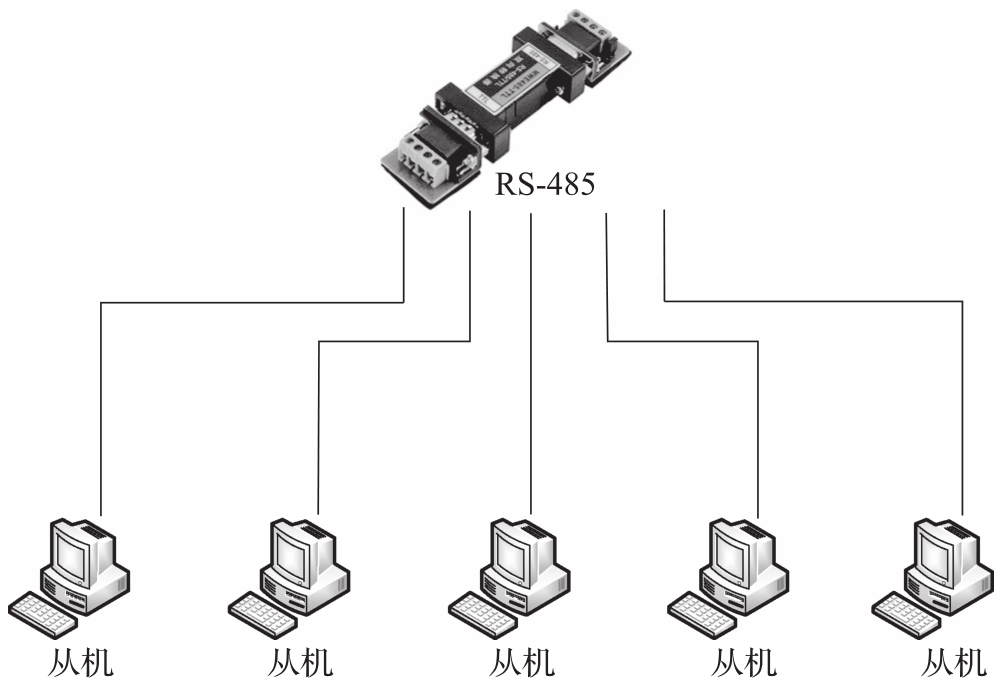 由于工业现场通信节点众多,相互之间距离较远且外部电磁环境复杂,对于工业网络通信而言,人们需要一种采用最少连线连接各个通信节点,并且具有一定抑制外部干扰能力的通信方式来完成工业现场的通信任务。RS-422/485标准采用屏蔽双绞线铜缆,并运用差分电路技术,允许一对多的通信方式。这些标准有效减少了噪声干扰,且具备较高的抗干扰能力和较长的传输距离。图3-5为RS-485一对多通信示意图。