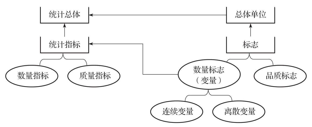 二者的联系主要表现为:①指标数值都是由总体单位的数量标志值汇总而来的;②指标与数量标志存在一定的变换关系,随着研究目的的变化,总体和总体单位发生了变化,指标和标志也会发生相应的变化。例如,如果所要研究的是全国工业企业情况,则各企业的职工人数、固定资产、工业增加值等都是总体单位(即各个企业)的标志,而如果研究目的变成研究某一企业的职工状况,则该企业变成了一个总体,企业职工人数变成了统计指标,每个职工的文化程度、技术等级、性别、年龄等就成为标志。统计总体、总体单位、统计指标、标志等基本概念之间的关系如图1-6所示。