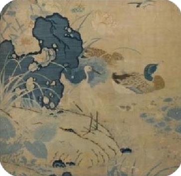 缂丝起源于汉代,以生蚕丝为经线,彩色熟丝为纬线,所织成画作兼具手绘的色彩之美和刺绣的质感之美,是一种工艺美术“新形态”。通经回纬的缂丝方法需要复杂精密的计算,体现着中国传统艺术与自然科学智慧的融合,被誉为“寸缕寸金”,也是古代社会经济繁荣的见证。在这幅《缂丝莲塘乳鸭图》中,大鸭带着小鸭在池塘游泳,寓教于乐、融学于趣、化教于心。