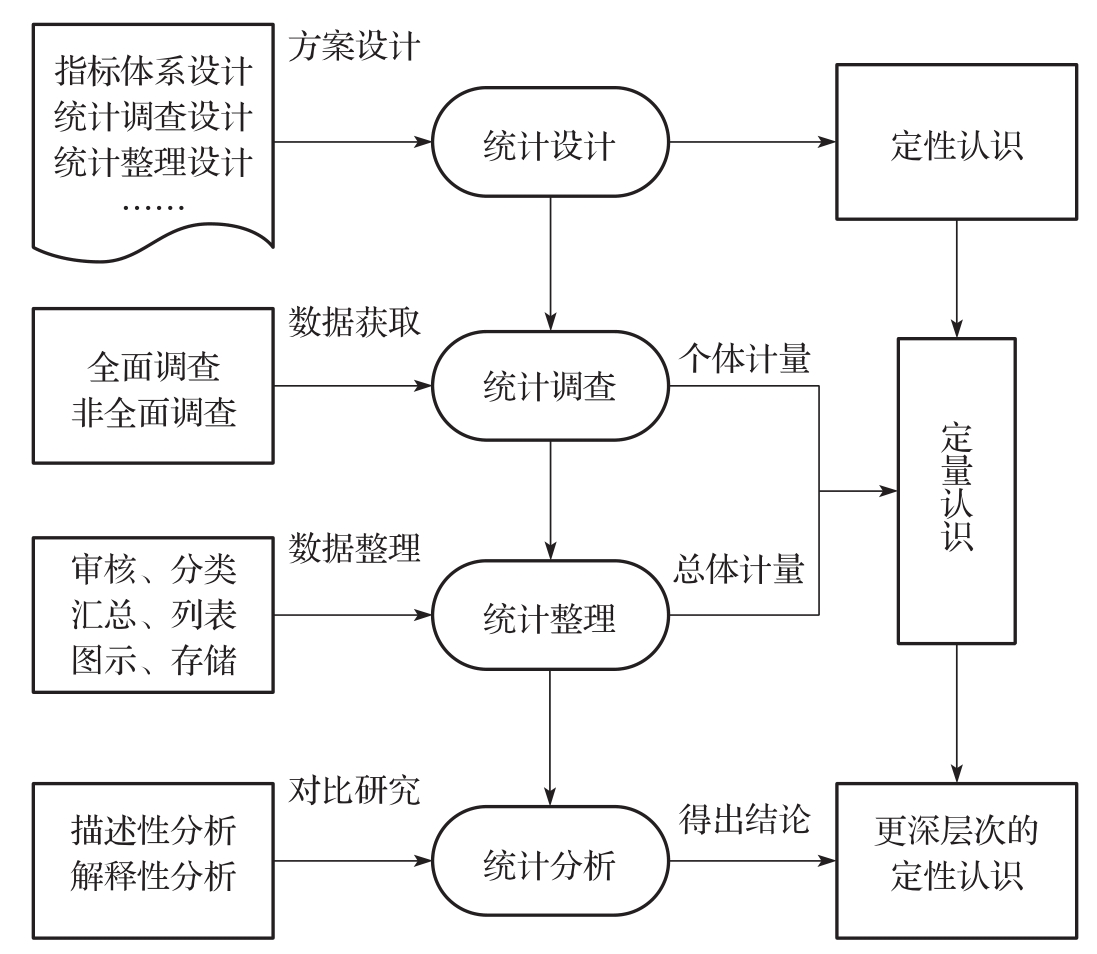 统计工作是对社会经济现象总体数量进行的一种调查研究活动,也是对事物的表面、本质及其规律性的认识活动。这一活动是一个由浅入深的过程,这个过程可以概括为统计设计、统计调查、统计整理、统计分析四个阶段。