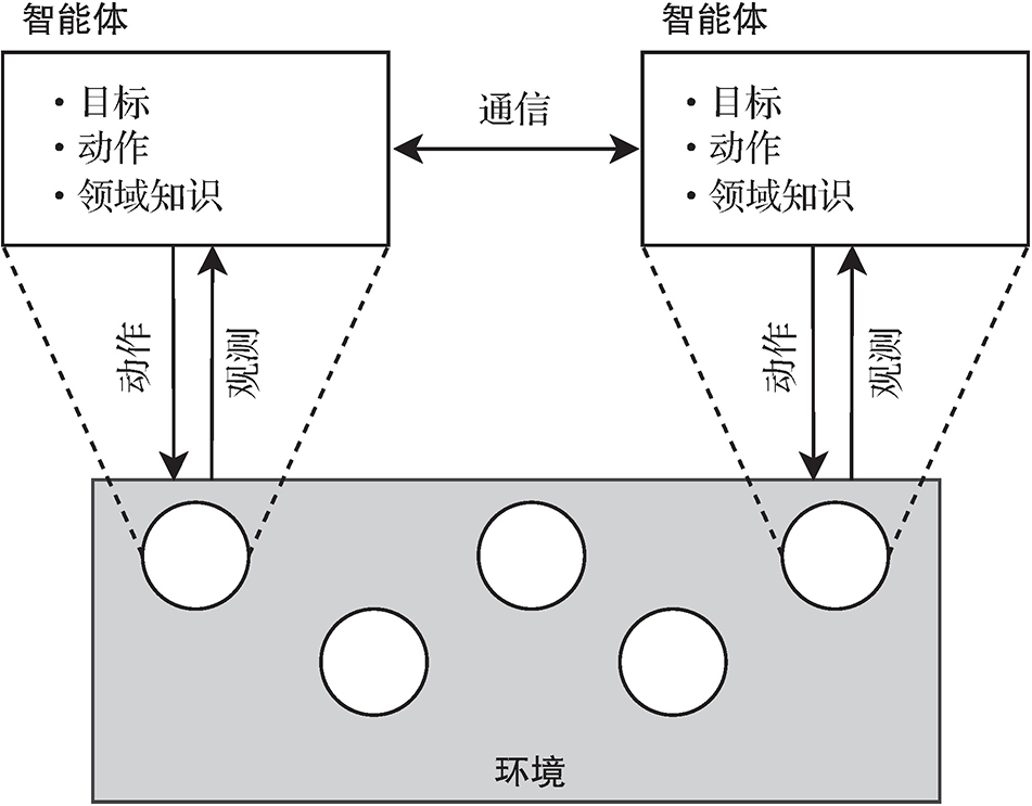 试想这样一种场景:有一群能够自己做出决策的自主智能体,为了实现特定目标必须在共享环境中进行交互。这些智能体可能有共同的目标,比如让一组移动机器人在一个大型仓库中收集和运送货物,或者让一组无人机监控一个发电厂;这些智能体也可能有相互冲突的目标,比如在虚拟市场中进行商品交易的智能体,每个智能体都试图最大化自己的收益。由于我们并不确切知道应该如何让各个智能体进行交互来实现其目标,因此我们的做法是让它们自己去探索。因此,智能体开始在其所处的环境中尝试各种动作并收集经验,包括环境因其动作而导致的变化以及其他智能体是如何行动的。随着时间的推移,智能体开始学习各种概念,例如,解决任务所需的技能,以及更重要的是学习如何与其他智能体协调行动。它们甚至可能学会开发一种共享语言,以便实现智能体之间的交流。到最后,智能体的能力会达到一定水平,并成为以最优方式进行交互来实现目标的专家。