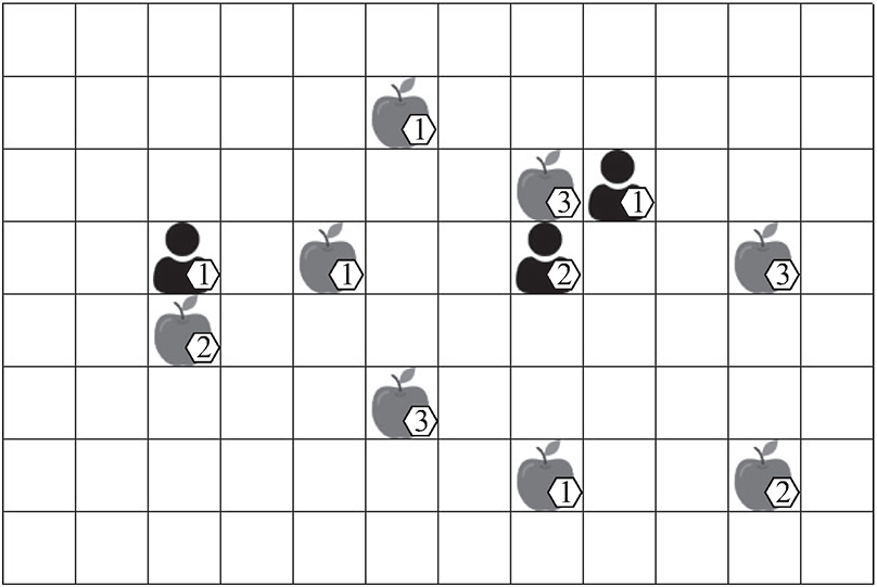 图1.2 一个基于等级的搜寻任务,其中由三个机器人组成的小组必须收集所有物品(如图中的苹果),每个机器人由一个智能体控制。每个机器人和物品都有一个相关的技能等级显示在右下角,如图所示。一个或多个机器人组成的小组只要位于物品旁边,且机器人的等级总和大于或等于物品的等级,就可以收集物品