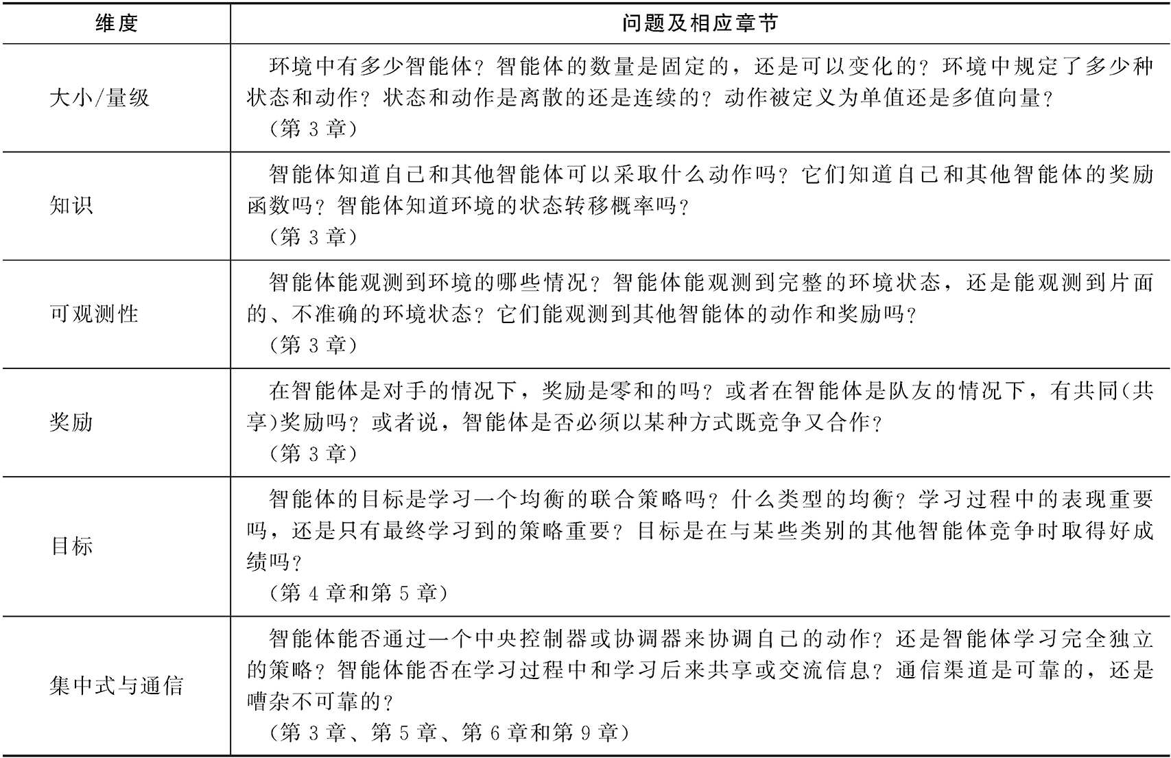 多智能体系统的研究在人工智能领域有着悠久的历史,并涉及广泛的技术问题(Shoham和Leyton-Brown,2008;Wooldridge,2009)。这些问题包括:如何设计算法使智能体能够选择最优动作,以实现其特定目标;如何设计环境激励智能体的某些长期行为;如何在智能体之间进行沟通和传播;如何在智能体群体中形成规范、惯例和不同的角色。本书关注的是这些问题中的第一个,重点是使用强化学习技术优化和协调智能体的策略,以最大限度地提高它们随时间积累的奖励。