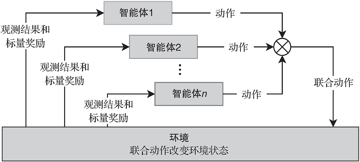 。与单智能体算法类似,多智能体强化学习的策略也是通过试错来学习的,目的是使智能体的累积奖励或回报最大。图1.3展示了MARL的基本示意图。一组智能体(