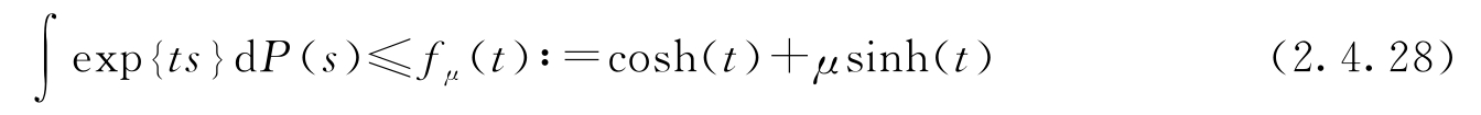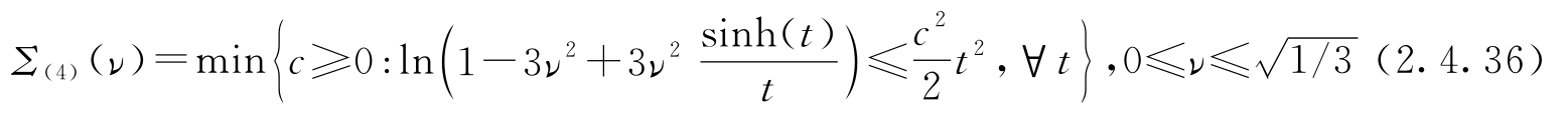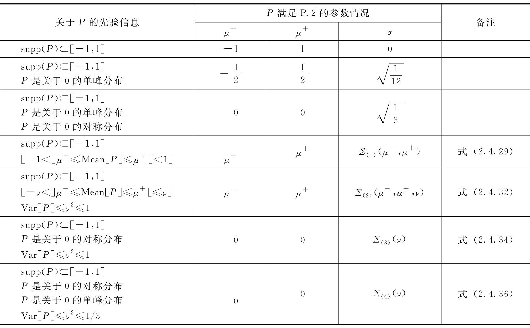 例2.4.13 假设我们所知道的概率分布 P 的支持范围是[-1,1],并且是关于0的对称分布和单峰分布,另外,Var[ P ]≤ ν 2 ≤1/3( ν 的上界是自然的——可以看出这是由 P 的其他假设所隐含的)。我们有以下结论。