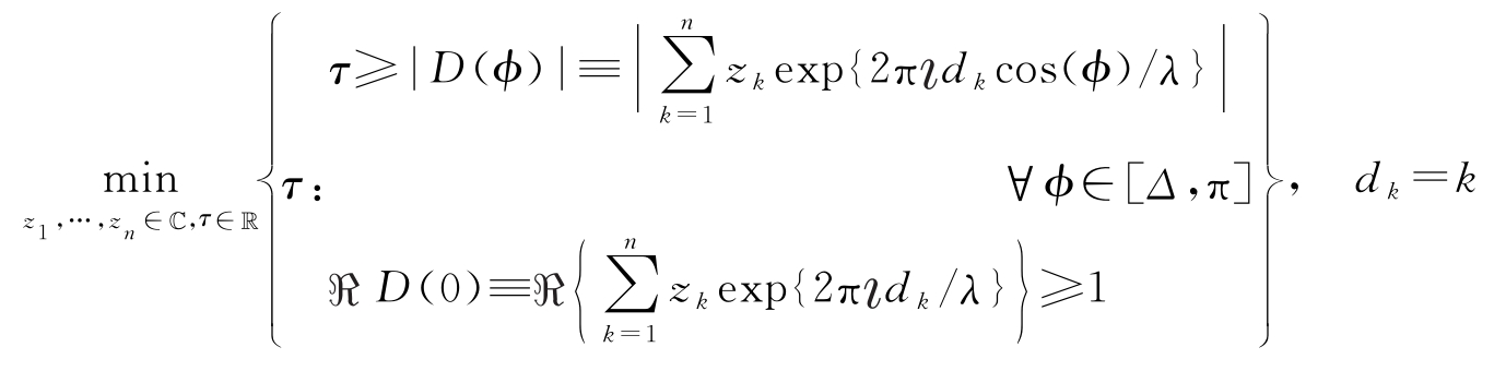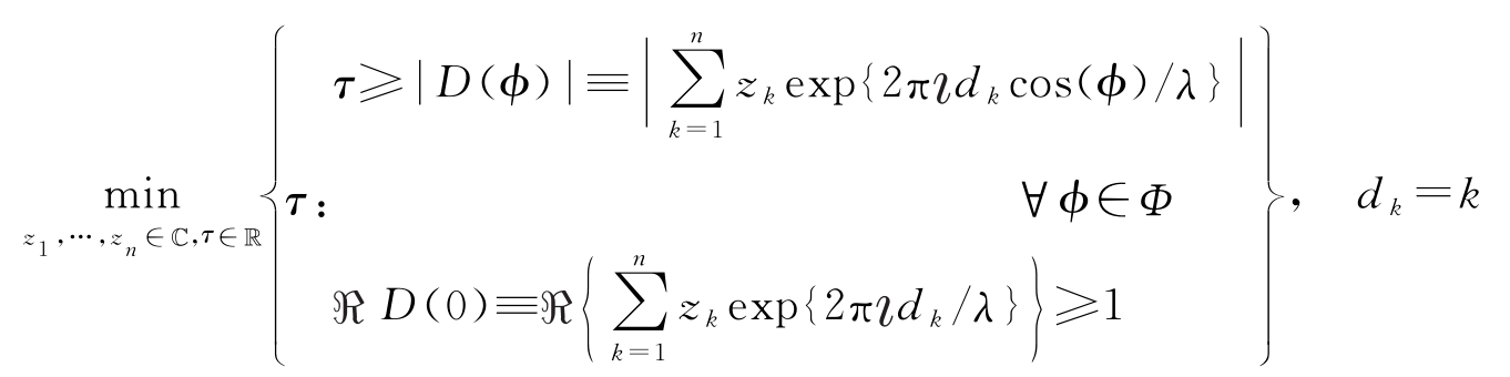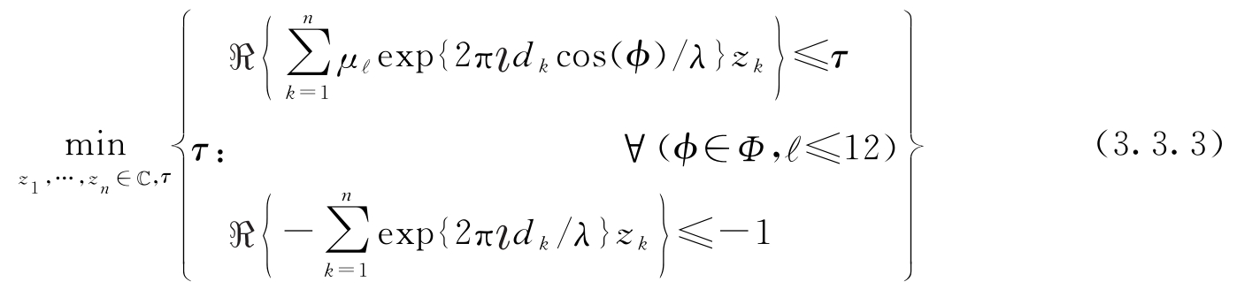 天线设计问题 :给定振荡器个数 n ,波长 λ ,在区间[ Δ ,π]上感兴趣的角度 Δ 和一个有限的网格 Φ ,解决如下LO规划
