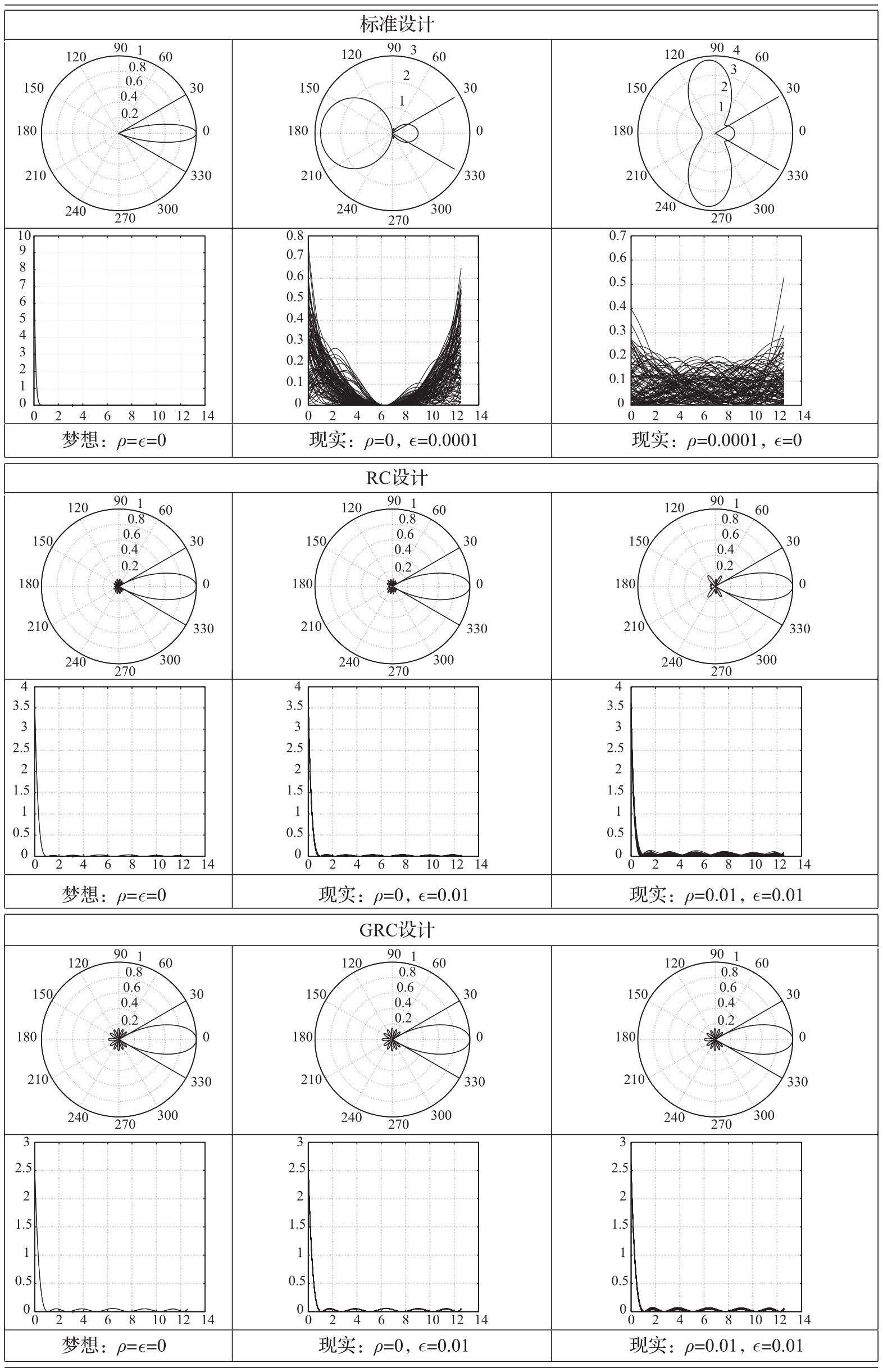 图3-1 提供了标准的、RC和GRC的天线设计方案。第一行:极坐标中| D ( ϕ )|的样本图;这些图被归一化为 D (0)=1。第二行:100个模拟能量密度束