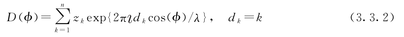 例3.3.1 考虑一个沿轴放置的 n 个元素组成的等距振子单元网格 P k = k i ,其中, i 表示 x 轴的基向量。这种天线的图只取决于三维方向 e 与 x 轴方向 i 之间的夹角 ϕ ,0≤ ϕ ≤π ,且给定