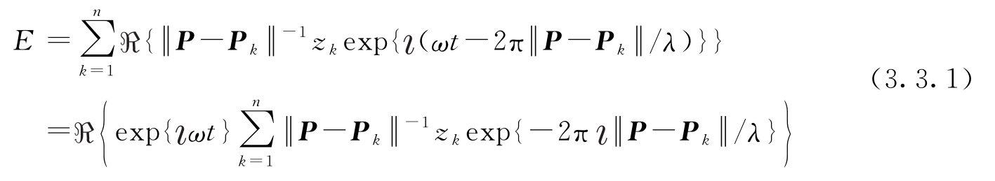 天线阵列 。发射天线最基本的元件是发射波长为 λ 和频率为 ω 的球形单色电磁波的各向同性谐波振荡器。当它们被调用时,振荡器产生一个电磁场,其在点 P 处的电分量为