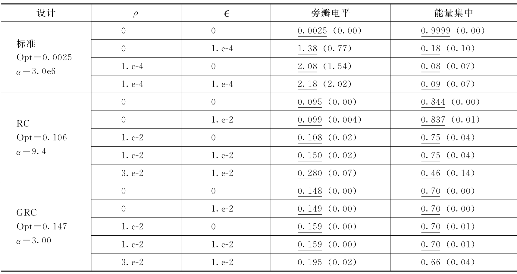 。“旁瓣电平”和“能量集中”列中用下划线标出来的数据是100个随机实现的定位误差或驱动误差的平均值,括号中的数值是相关的标准差。