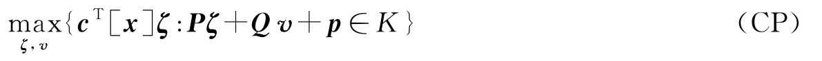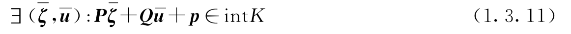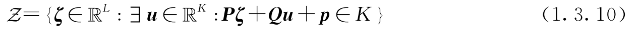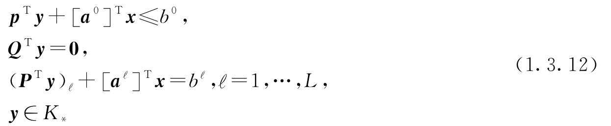 定理1.3.4 扰动集 Z 由式(1.3.10)给出,在非多面体 K 的情况下,令式(1.3.11)也成立。则半无限约束(1.3.6)可以表示为变量 x ∈ℝ n , y =ℝ N 的下列锥不等式组: