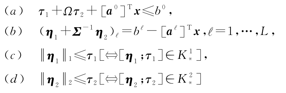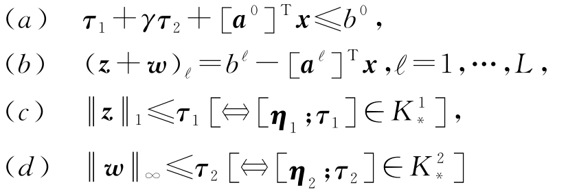 设 y 1 =[ z ; τ 1 ], y 2 =[ w ; τ 2 ],其中 τ 为1维, z 和 w 为 L 维,组(1.3.14)成为变量 τ 1 , τ 2 , z , w , x 的约束组: