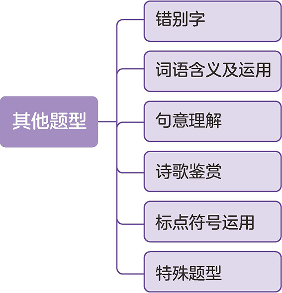 1.其他题型涉及错别字、词语含义及运用、句意理解、诗歌鉴赏、标点符号运用和特殊题型等。