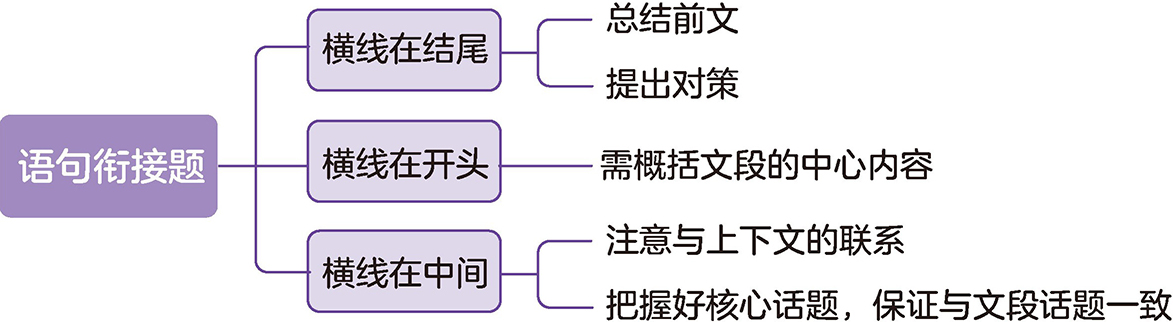 【注意】 横线在结尾,一般起到总结概括前文的作用,类似“分—总”结构,要么前文列举现象,尾句总结前文,要么前文提出问题,尾句提出对策,要把握前文的核心话题,使填入句子的核心话题与前文保持一致。