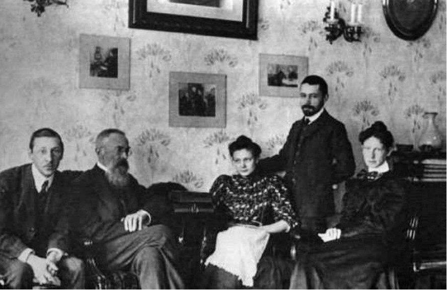 1908年,圣彼得堡,扎格洛尼大道,伊戈尔和凯瑟琳·斯特拉文斯基与尼古拉·里姆斯基科萨科夫、他的女儿娜杰日达(Nadezhda)和未婚夫马克西米利安·施泰因贝格(MaximilianSteinberg)合影。