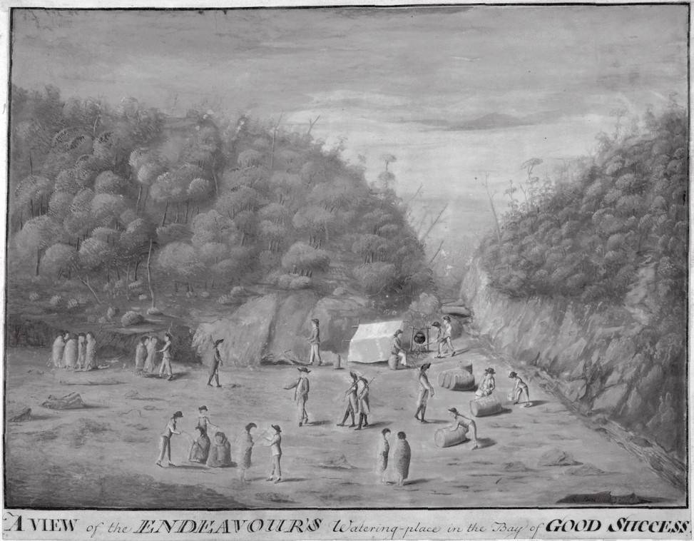 图1.1 这幅由苏格兰风景画家亚历山大·巴肯(Alexander Buchan)绘制的作品描绘了“奋进号”船员在火地岛好胜湾的海岸上给水桶加满水并与豪什人交流的场景。