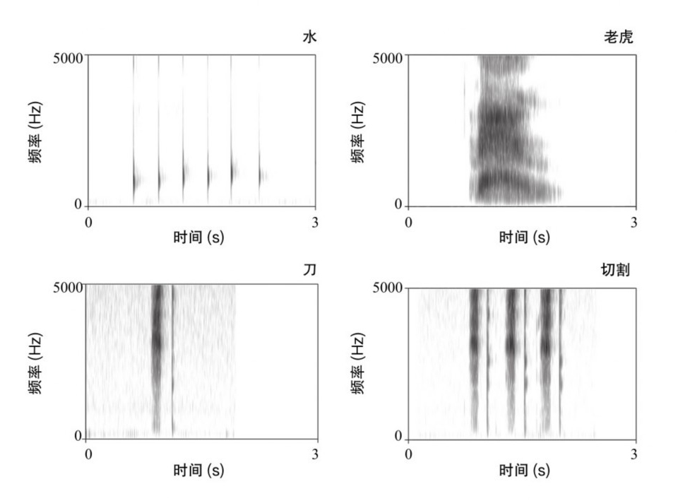 为了弄清楚是否有可能用发声来传达不同概念,帕尔曼还举办了一场奖金为1000美元的声音象形挑战赛。参赛者需要提交由人类发声器官发出的不同声音,用来代表各种含义,包括名词(如刀、水、老虎)、动词(如烹饪、打猎、切割)、形容词(如坏、大、无聊),以及语法上更专门的概念(如一、多、这)。这些参赛作品里有许多有趣的发音,如“滴、滴、滴”的声音表示“水”,低沉的咆哮声表示“老虎”,“嗖”的一声表示“刀”,多次重复的嗖嗖声表示“切割”,即刀被用作切割工具(例子见图1.3)。另一位参赛者用“哇”表示“一”,重复三次的哇哇哇表示“多”,表明了“多”的概念可以简单地理解为“一”的多次重复。每个参赛作品的评估方法都是让不熟悉的听众猜测它们的意思。获奖作品的猜测正确率高达57%(而随机猜测正确率只有10%左右)。