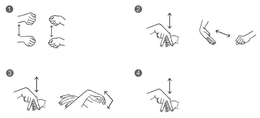 图1.2 第一代尼加拉瓜手语使用者用来表示“马”的四种不同手势:(1)握着马的缰绳,手上下摆动;(2)首先是一个人跨骑在马上,接着做出手握缰绳(左手)、拍马屁股(右手)的动作;(3)同样是一个人骑在马上,接着做出马尾巴摆动的动作(右手);(4)只做出一个人跨骑在马上的手势。到了第三代,所有学生都使用了第四种“马”的单一手势。(苏妮塔·克里斯蒂安森[Sunita Christiansen]绘图。)