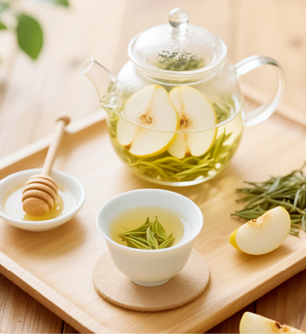 材料: 绿茶3克,香梨、蜂蜜各适量。