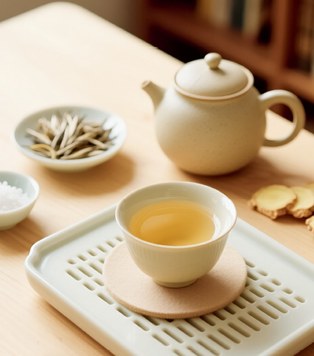 做法: 将君山银针、生姜一同用沸水冲泡30分钟,加少许精盐即可。