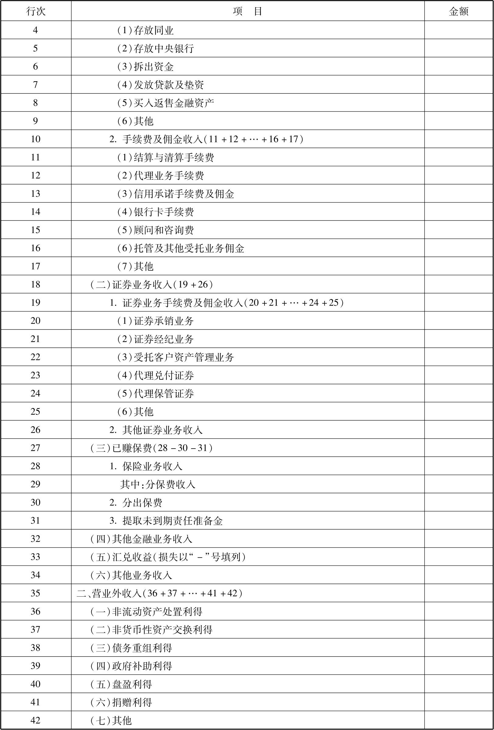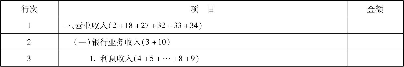 本表包括“营业收入”和“营业外收入”两个部分。“营业收入”包括6项,即“银行业务收入”“证券业务收入”“已赚保费”“其他金融业务收入”“汇兑收益”“其他业务收入”。农村信用社的业务收入一般纳入银行业务收入管理和填报。信托业务收入、保险资产管理业务收入、基金管理业务收入都可以纳入“其他金融业务收入”管理和填报。