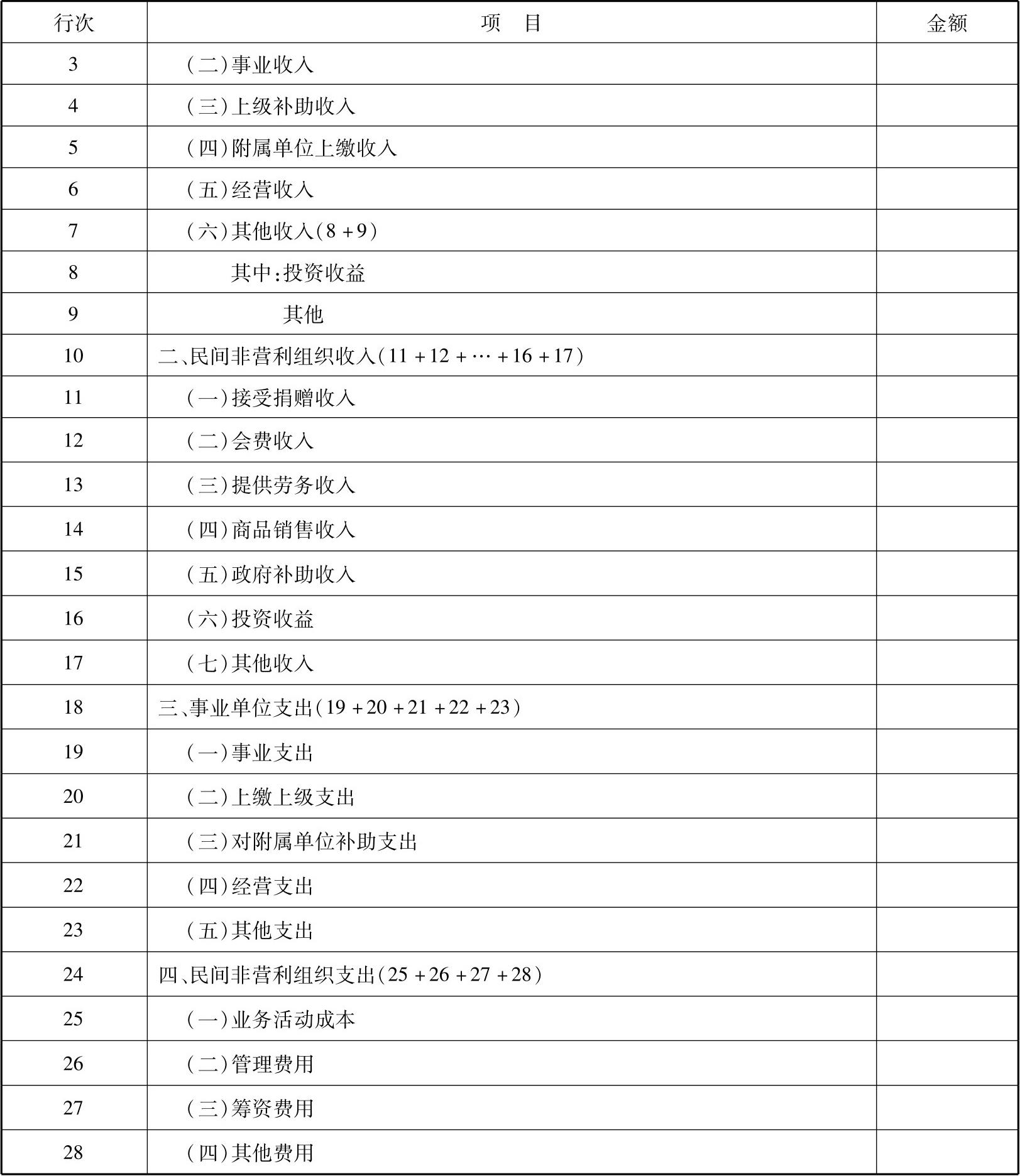 本表包括“事业单位收入”“民间非营利组织收入”“事业单位支出”“民间非营利组织支出”4个部分,而“事业单位收入”包括6项,即“财政补助收入”“事业收入”“上级补助收入”“附属单位上缴收入”“经营收入”“其他收入”。