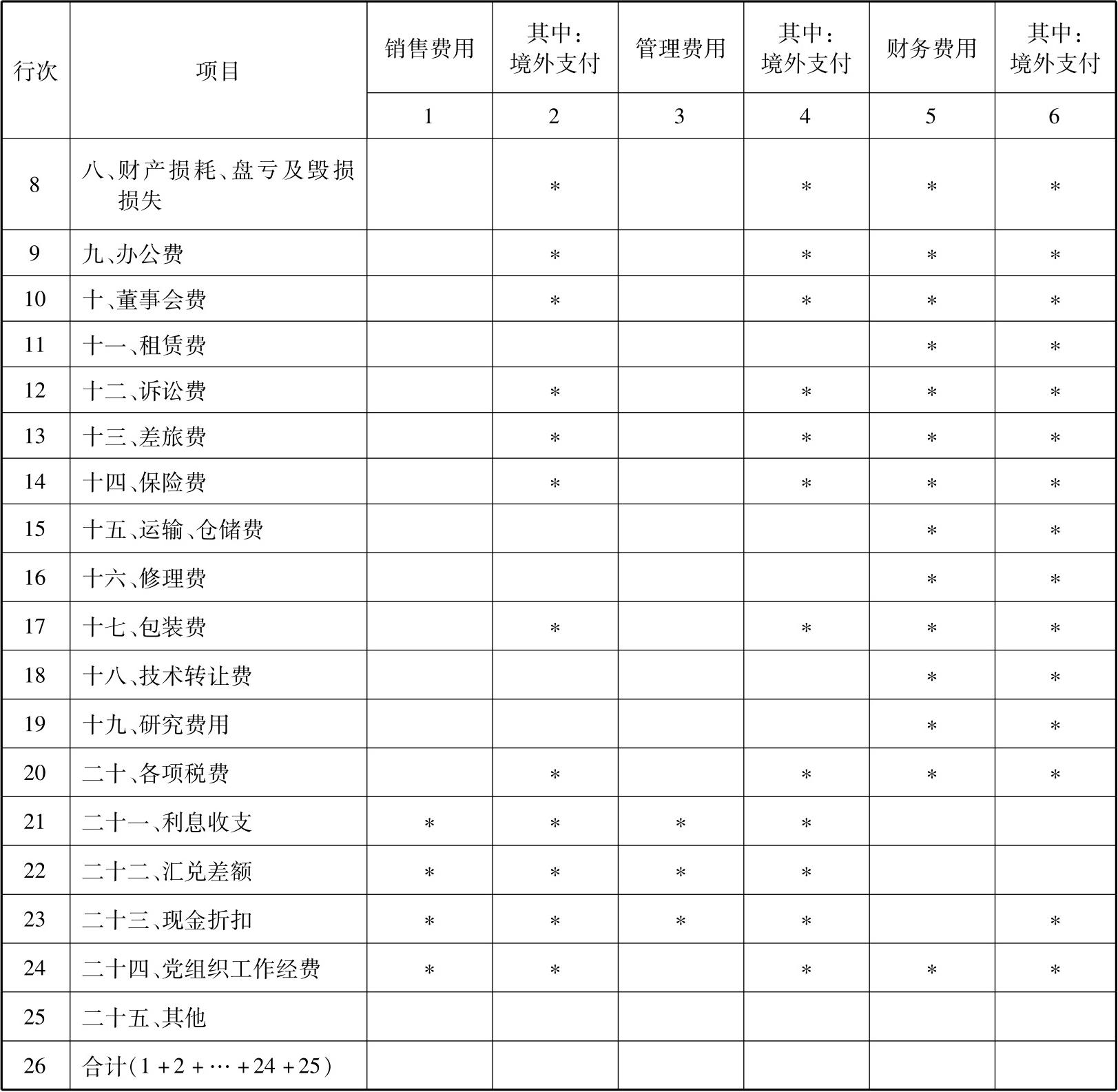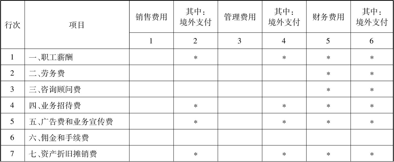 本表包括“销售费用”“管理费用”和“财务费用”3个部分,费用包括25项,即“职工薪酬”“劳务费”“咨询顾问费”“业务招待费”“广告费和业务宣传费”“佣金和手续费”“资产折旧摊销费”“财产损耗、盘亏及毁损损失”“办公费”“董事会费”“租赁费”“诉讼费”“差旅费”“保险费”“运输、仓储费”“修理费”“包装费”“技术转让费”“研究费用”“各项税费”“利息收支”“汇兑差额”“现金折扣”“党组织工作经费”和“其他”。