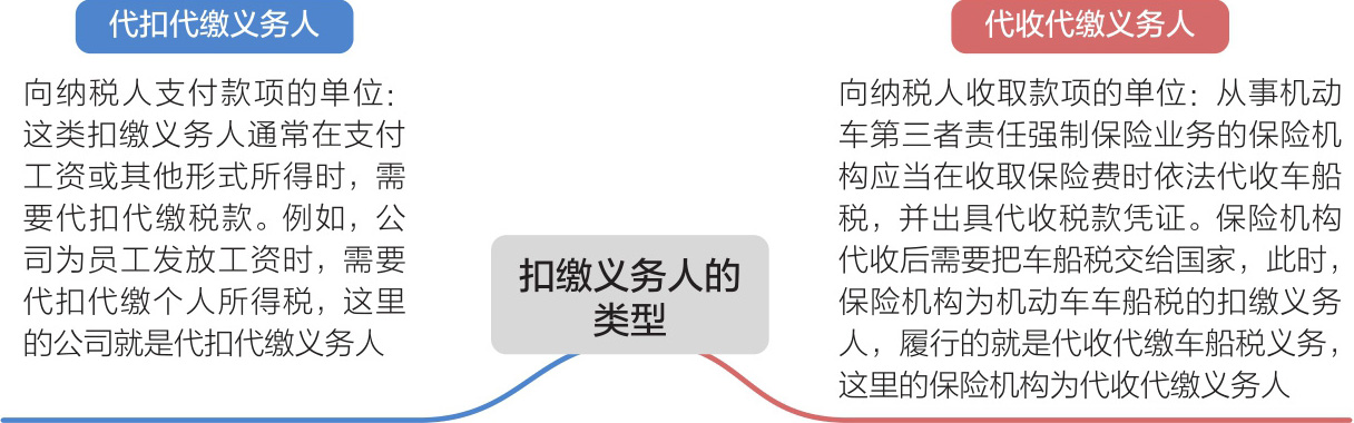 扣缴义务人的扣缴义务是根据不同税种的实体法律、行政法规来规定的,因此,不同税种的扣缴义务人范围并不一致。归纳起来,主要分为代扣代缴义务人和代收代缴义务人两种类型(如图1-1所示)。