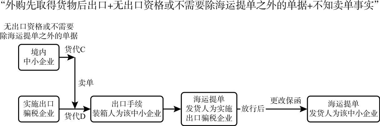 三是“外购先取得货物后出口+无出口资格或不需要除海运提单之外的单据+不知卖单事实”。境内某中小企业从加工厂外购并取得货物后将该批货物销售给国外公司,该单位找到货代C代理出口手续,集装箱由自己企业装货。由于该企业没有出口资格或者不需要除海运提单之外的单据,货代C将该单信息出售给货代D(货代C和货代D也可能是同一家),货代D为实施出口骗税企业的货代,货代C或货代D以实施出口骗税企业的名义代理出口手续(包括订舱、取箱、安排货运公司、报关等),该流程中仅集装箱装箱过程中显示出该中小企业的名称,取得海运提单(发货人为实施出口骗税企业)。海关放行后,货代C或货代D向船公司提交更改保函并将海运提单的发货人由实施出口骗税企业修改为真实货主,即该中小企业(如图3所示)。