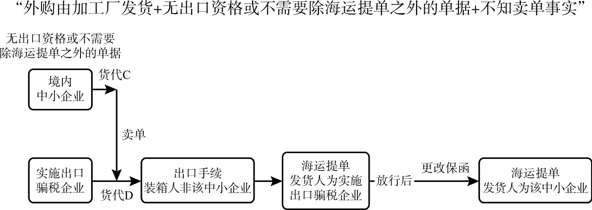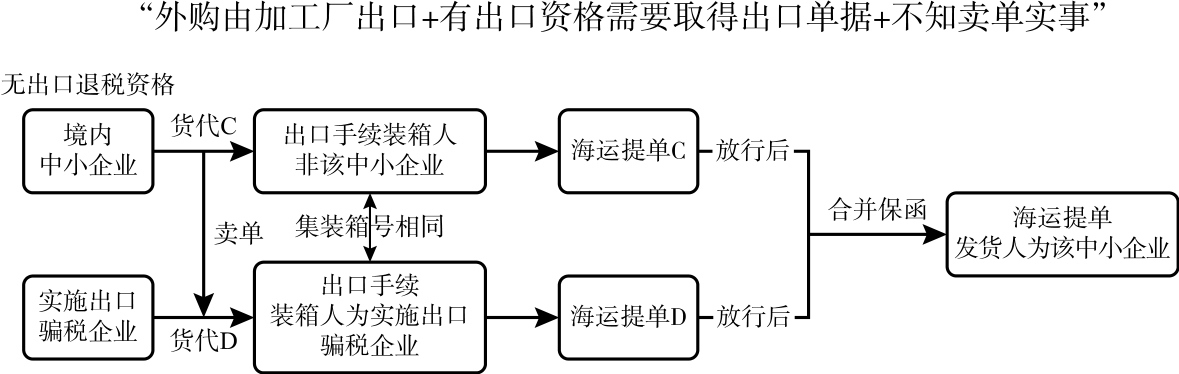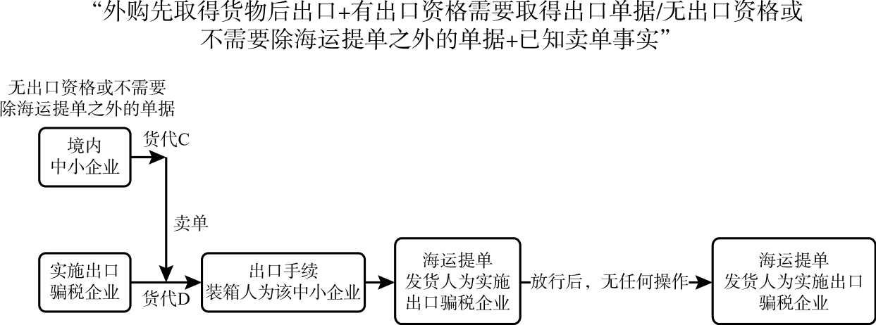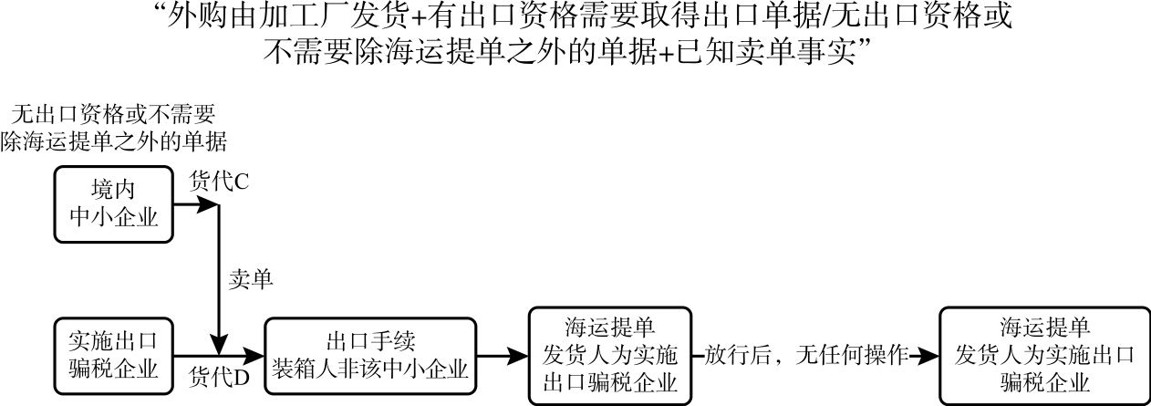 五是“外购先取得货物后出口+有出口资格需要取得出口单据/无出口资格或不需要除海运提单之外的单据+已知卖单事实”。境内某中小企业从加工厂外购并取得货物后将该批货物销售给国外公司,该单位找到货代C代理出口手续,集装箱由自己企业装货。由于该企业已知卖单事实(卖单可以免除自身的报关费用,约200元人民币),货代C将该单信息出售给货代D(货代C和货代D也可能是同一家),货代D为实施出口骗税企业的货代,货代C或货代D以实施出口骗税企业的名义代理出口手续(包括订舱、取箱、安排货运公司、报关等),该流程中仅集装箱装箱过程中显示出该中小企业的名称,取得海运提单(发货人为实施出口骗税企业)(如图5所示)。