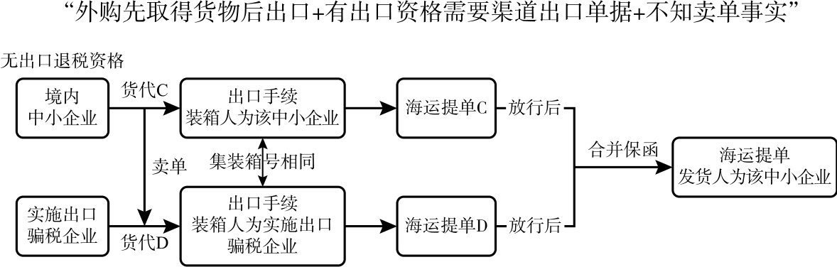 一是“外购先取得货物后出口+有出口资格需要取得出口单据+不知卖单事实”。例如,境内某中小企业从加工厂外购并取得货物后将该批货物销售给国外公司,该单位找到货代C代理出口手续(包括订舱、取箱、安排货运公司、报关等)并取得海运提单C,集装箱由自己企业装货。由于该企业没有出口退税资格,货代C将该单信息出售给货代D(货代C和货代D也可能是同一家),货代D为实施出口骗税企业的货代,货代D以实施出口骗税企业的名义报关出口,其中的集装箱号与该中小企业的集装箱号相同并显示为拼箱,取得发货人为实施出口骗税所需的企业海运提单D。海关放行后,货代D向船公司提交合并保函将海运提单C和海运提单D合并,取得海运提单(发货人为中小企业)并交给该中小企业(如图1所示)。