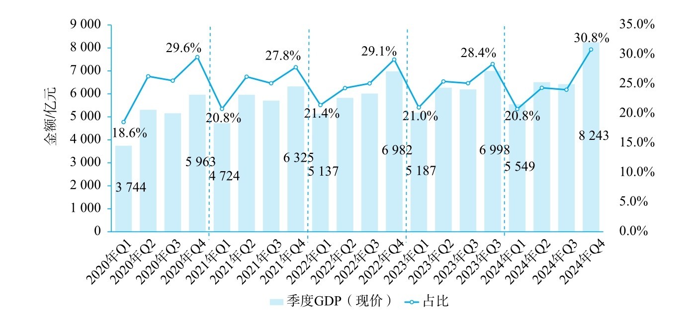 从走势来看,2020年至2024年期间,苏州市一季度GDP占比在21%左右,二、三季度GDP占比在25%左右,四季度GDP占比在29%左右,可见四季度是实现年度GDP目标的关键节点。