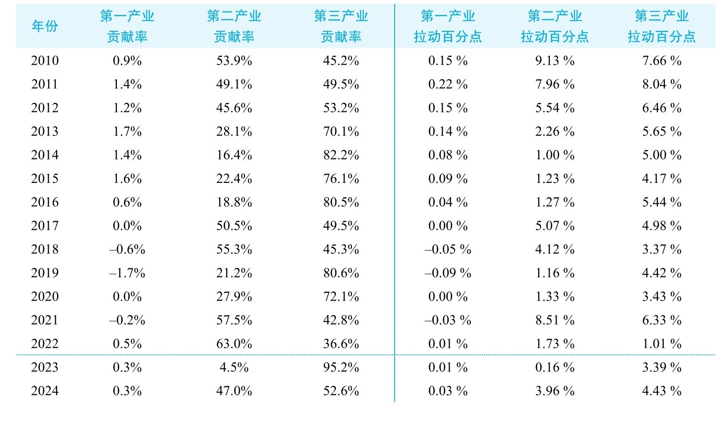 需要注意的是,表中计算贡献率使用的GDP数据为最终核实数,2023年、2024年大类行业增加值最终核实数暂未发布。
