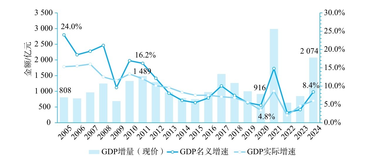 从现状来看,2024年苏州市GDP增量(现价)为2 074亿元,名义增速为8.4%,比实际增速6%高2.4个百分点。