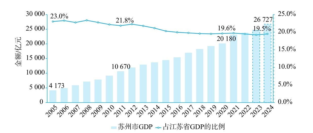 从现状来看,2024年苏州市GDP总量为26 727亿元,占江苏省GDP总量的19.5%,在全省各地级市中排名第一。