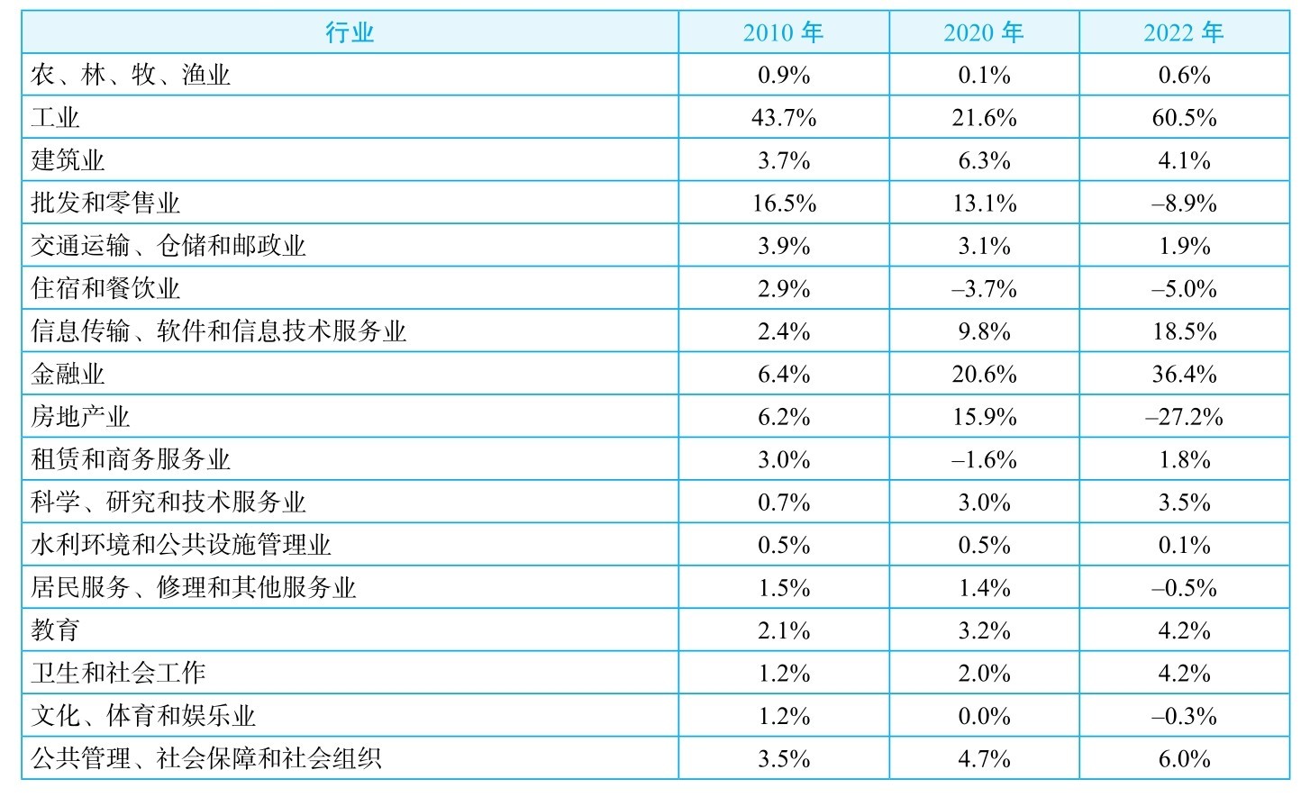 表1-3 苏州市大类行业GDP贡献率变化情况(2010—2022年)