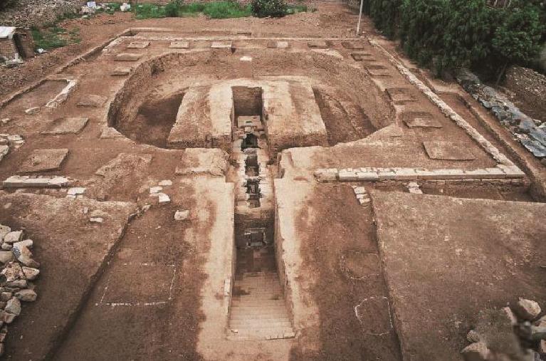 方形为唐代塔基,圆形为明代塔基,中部为唐代地宫。地宫形制一如唐朝帝王陵寝,但其建法却依密教布坛之法布置,结坛有序。
