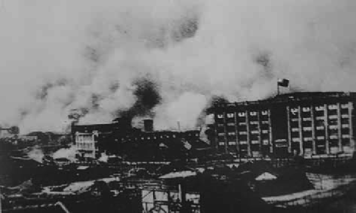 ▲战火笼罩的四行仓库