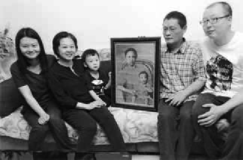 ▲陈红(左二)一家人与奶奶和父亲的画像合影,摄于2018年