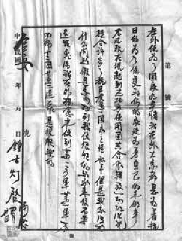 但是,自三原与家通信一次,也未曾〈知道〉家内接到了〈没有〉?现在也未见回音来,可不知家内怎么样?自我现在的国家,不过说,在外便为了国家的事情。我在外,大家都是为着抗日的,为了保护我们的家庭,为着自己的未〈来〉做事。不过,现在说起到达北方,使用〔实行〕国共合作、释放一切政治犯,联合许多了〔了许多〕抗日友军,国家已经和平。但是,我家没有什么问题。假是〔使〕家内接到我信,很快的与家〔我〕来信,不要递误,免得我在外挂念。来信〈寄〉到第一方〈面〉军第一军第四师十二团第三连。工作是很快乐的!