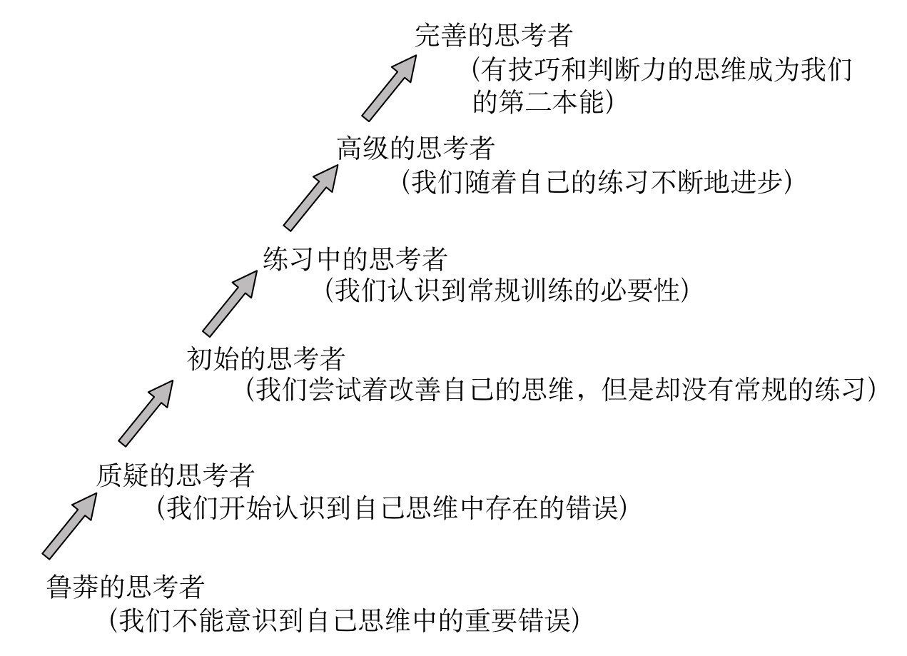 不同的人处于不同的思考阶段。我希望,学完这门课的你,起码能够成为一个“初始的思考者”,能够清晰地表达问题,检查信息的准确性和相关性,能够发现偏见、不公正,并尽量注意到何时的自己是以自我为中心的,能冷静地、就事论事地讨论问题。当然,也盼望你能进行更多的尝试,成为终生的思考者。千万不要担心自己的能力不足,我们每个人都是思考的练习者。