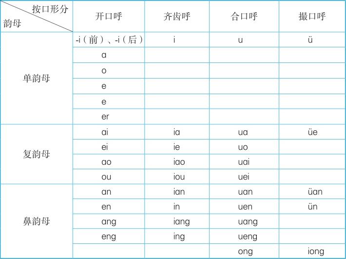 按汉语语音学的传统分析方法,根据韵母开头元音的唇形特点,可将韵母分为开口呼、齐齿呼、合口呼、撮口呼四类(见表2-2)。“四呼”即指开、齐、合、撮四类韵母。
