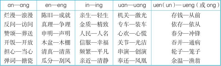 (3)几个元音有主有次,其中开口度较大、响度较大、发音较清晰的那个元音叫主元音,又叫“韵腹”。主元音前后的元音发音轻、短、模糊,分别叫“韵头”“韵尾”。根据主元音的不同位置,鼻韵母可分为前响复韵母、后响复韵母、中响复韵母三种。